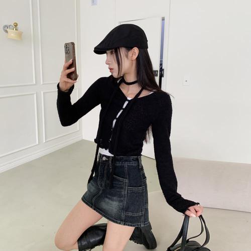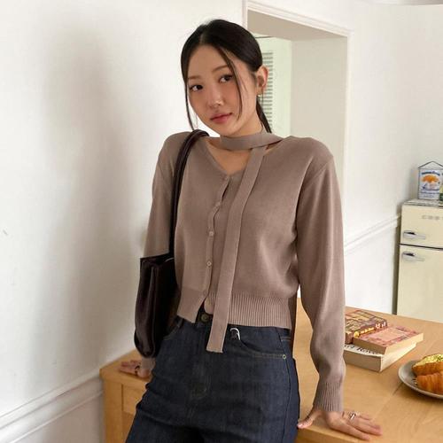 [옷자락] 여자 머플러 세트 포인트 버튼 니트 브이넥 가디건