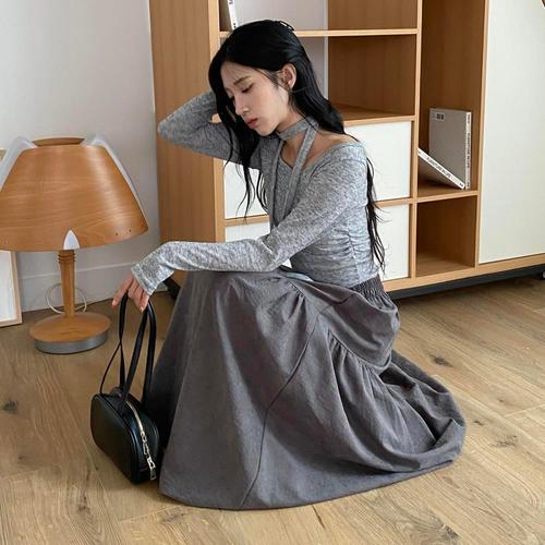 [옷자락] 여자 셔링 오프숄더 언발 머플러 티셔츠세트