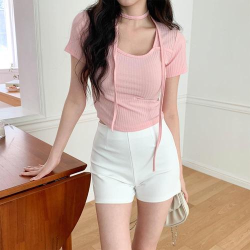 [옷자락] 여자 스퀘어넥 골지 세미크롭 반팔티 머플러 세트