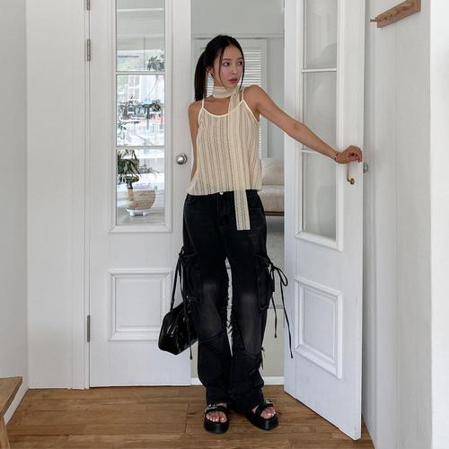 [옷자락] 여자 브이넥 테리 크롭 머플러 두줄나시 세트