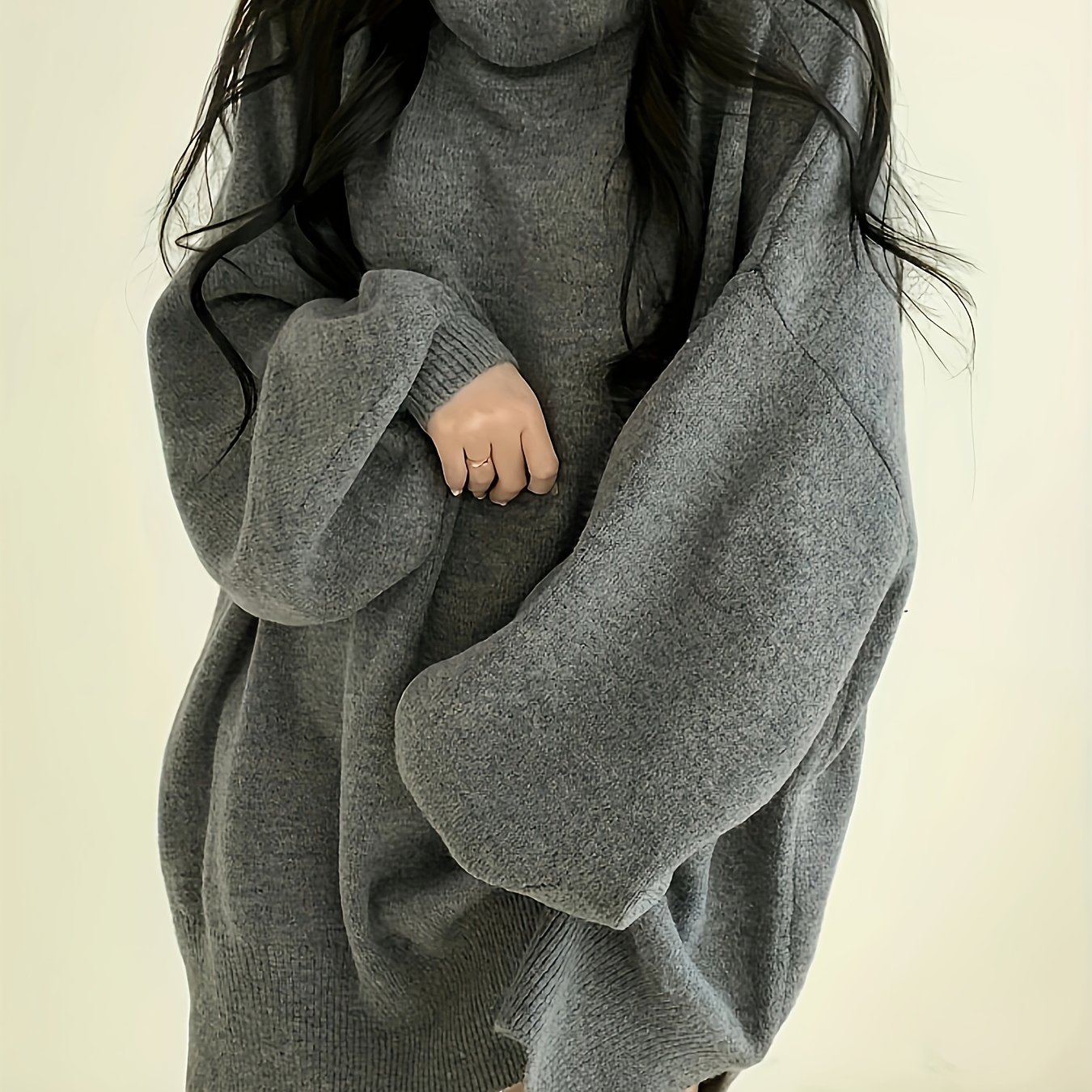 TEMU 고급스러운 하이 칼라와 분리된 밑단의 한국 스타일 솔리드 컬러 루즈 롱 스웨터, 부드럽고 푹신한 퍼프 소매