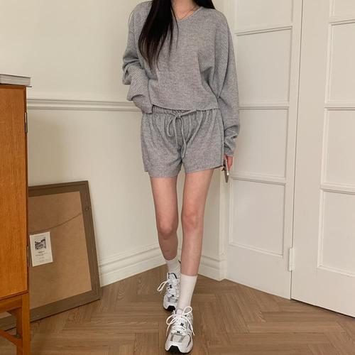 [옷자락] 여자 라운드넥 무지 크롭니트 반바지 세트