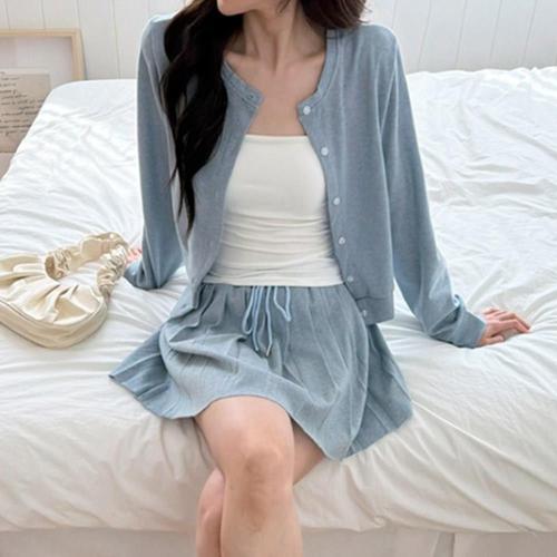 [옷자락]여성 라운드넥 버튼 가디건 플리츠 미니스커트 코디 세트