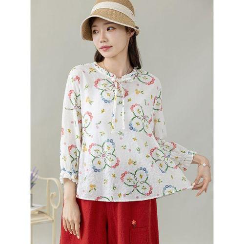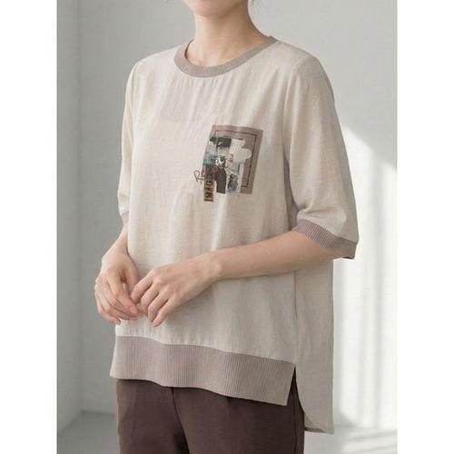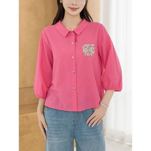 티티웍스 중년여성 V넥 잔꽃 언발란스 옆트임 코튼 7부 풀오버 셔츠형 블라우스