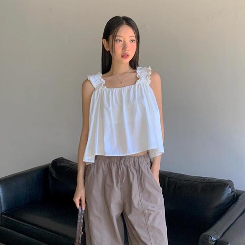 [옷자락] 여자 프릴 밴딩 숄더 스트랩 끈나시 블라우스