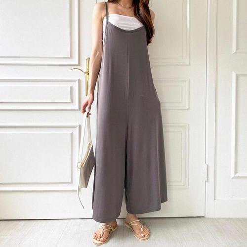 [옷자락] 여자 루즈핏 와이드 끈나시 포켓 폴리스판 점프수트