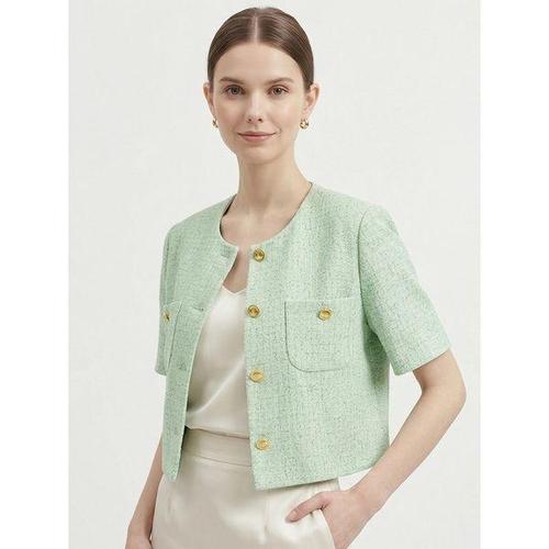 [엘린무드]라엘 울 트위드 도톰 슬림 노카라 금장 버튼 미니 데이트 키작녀 연말 파티 민트 고퀄 자켓 원..