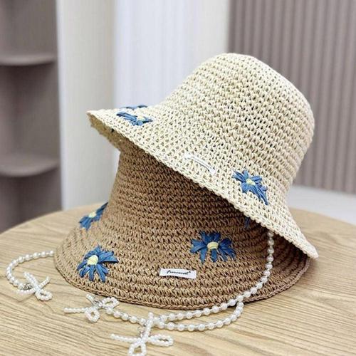 진주 블루 플라워 라탄 모자 벙거지 밀짚 휴양지 여성 여름 여자 WFJ9NAZ
