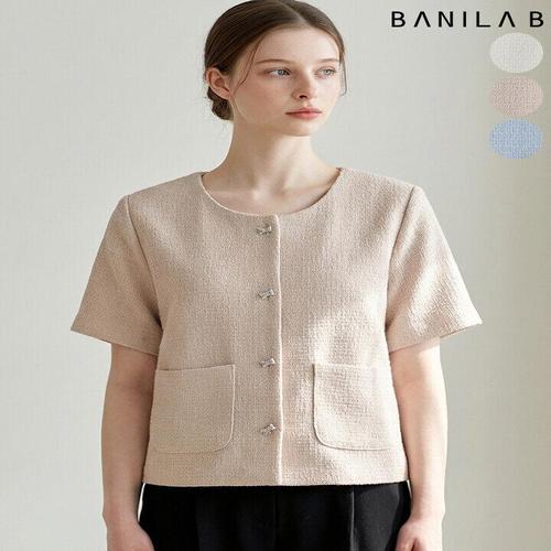 [바닐라비]여성 리본버튼 노카라 반팔 트위드 자켓