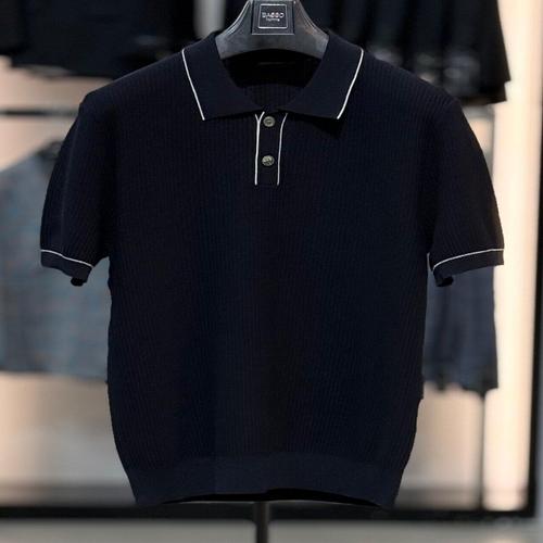 [바쏘옴므]네이비 배색 포인트 면혼방 카라 반팔 니트_SC