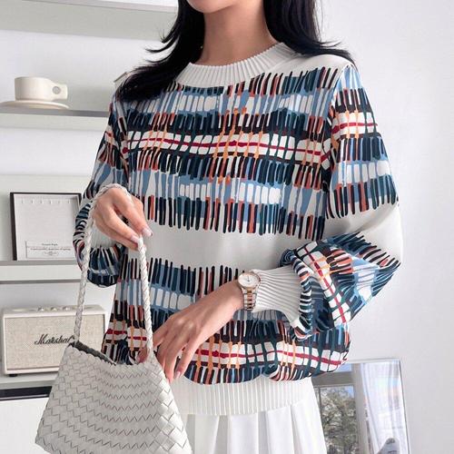 [옷자락] 여성 프린팅 플리츠 라운드넥 퍼프 봄 배색 블라우스