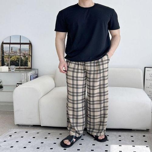 [에이치플러스몰]09남성 시원 쿨소재 체크 핀턱 와이드 밴딩팬츠