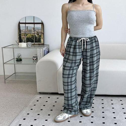 [에이치플러스몰]09여성 찰랑 쿨소재 체크 핀턱 와이드 밴딩 팬츠