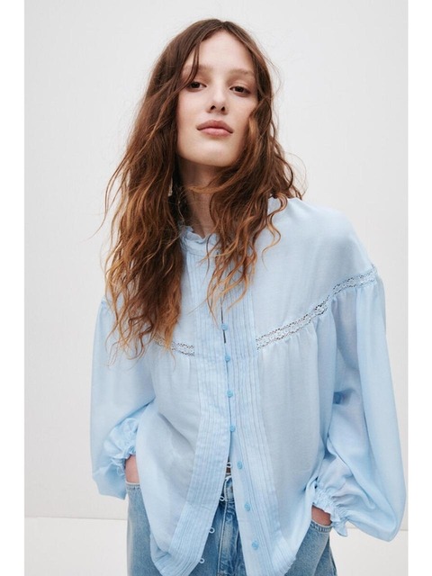 [에이치엔엠] 프릴 트리밍 벌룬 슬리브 블라우스 라이트 블루 1334998001