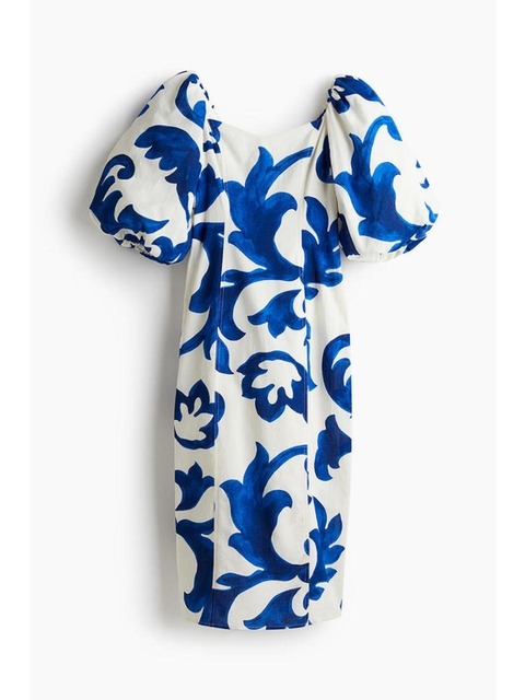 [에이치엔엠] 벌룬 슬리브 드레스 화이트/블루 패턴 1238363001