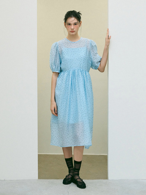 [이제이노리] 도트 패턴 블루 벌룬소매 드레스
