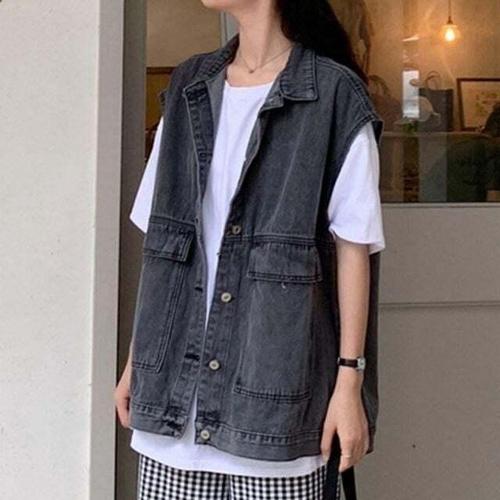 [셀럽하우스]간절기 XMQA9558 여성 캐주얼 오버핏 데님 필수템 카라 조끼 베