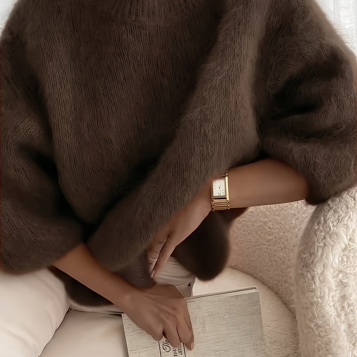 TEMU 여성 가을/겨울 라운드넥 반팔 풀오버 스웨터, 부드럽고 편안한 플러시감의 루즈핏 두꺼운 탑