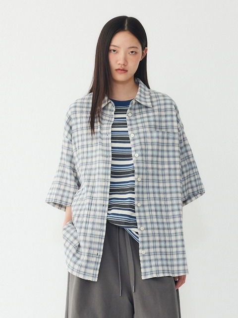 그라네아 여성 깅엄체크 남방 루즈 오버핏 블루 롱 셔츠