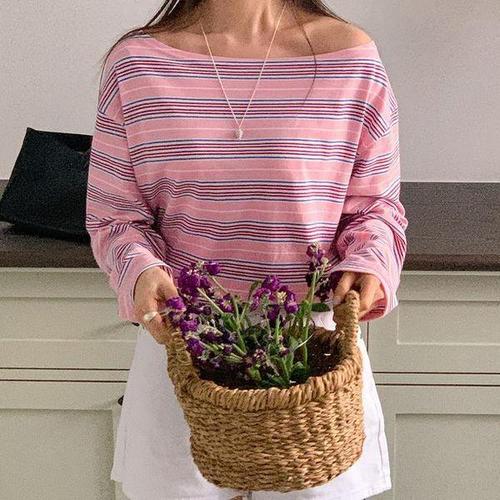 [셀러허브_여성트랜드패션]여자 박스 빅사이즈 입술넥 줄무늬 티셔츠