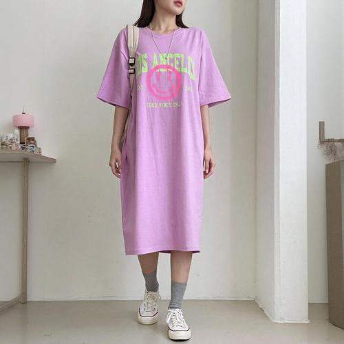[더바디시크릿]빅사이즈 스마일 프린팅 반팔 롱원피스 여름 루즈핏 체형커버
