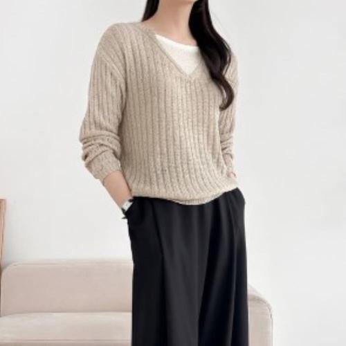 POMTOR 여성 베이직 루즈핏 브이넥 긴팔 골지 빅사이즈 니트 이너 티셔츠