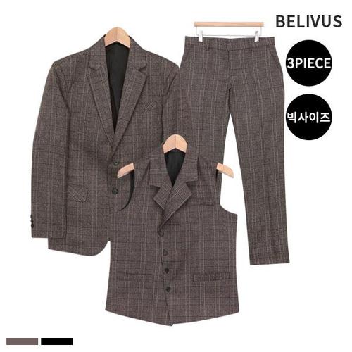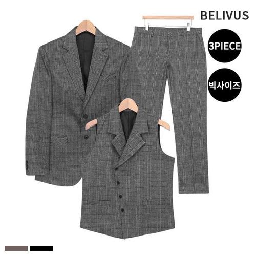 [빌리버스]남자 빅사이즈 스리피스 셋업 BIT047 남성 카라 베스트 체크 슬랙스 자켓 수트 세트