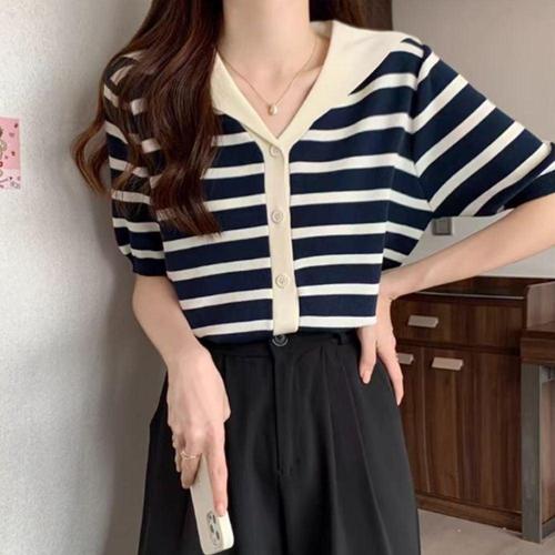 [셀럽하우스]반팔 QEYX7176 니트 가디건 세일러 카라 여름 단가라 티셔츠