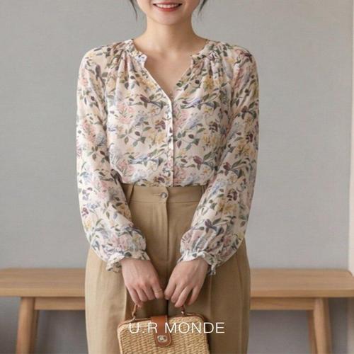 [유아몽드]플라워 패턴 쉬폰 블라우스 루즈핏 헨리넥 셔츠 가든