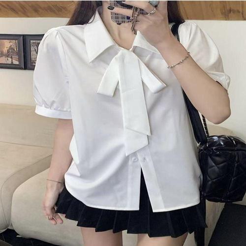 카라블라우스 리본 퍼프소매 셔츠 타이 셔링 여름반팔 WFKBWX2