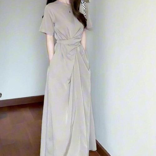 여성 롱원피스 라운드넥 여유 소매기장 반팔원피스 허리포인트 WFK0D54
