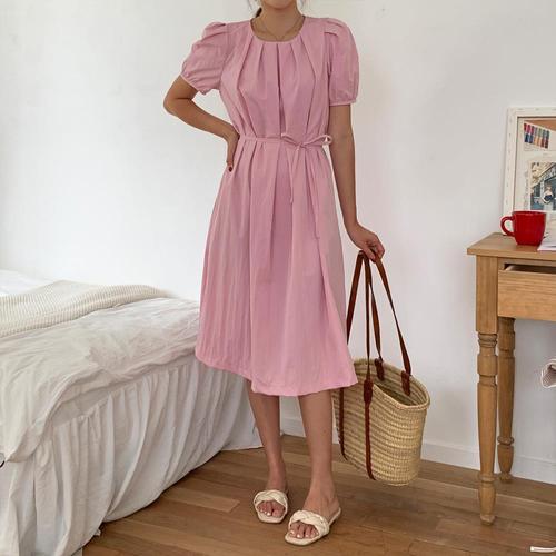 [옷자락] 여자 라운드넥 맞주름 퍼프 소매 나일론 롱원피스