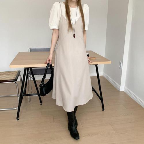 [옷자락] 여자 퍼프 소매 뷔스티에 미디 원피스 블라우스 세트