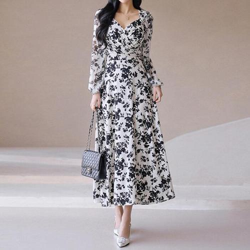 아레초 D121-9 여성 빅사이즈 로맨틱 플라워 쉬폰 브이넥 긴소매 롱 원피스