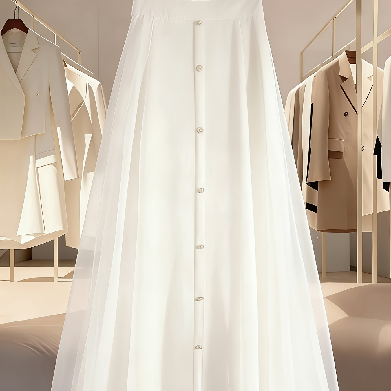 TEMU 여성용 화이트 플로우리 롱 스커트, 봄/여름/가을용, 하이웨이스트 싱글브레스티드 A라인 纸喇叭 치마, 부드럽고 우아한 요정 같은 플로우리 미디 기장