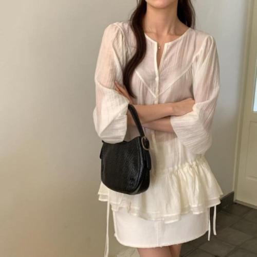 [다잇템]여자 벌룬 티어드 롱슬리브 비침 시폰 블라우스