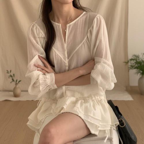 [다잇템]여성 비침 시폰 롱슬리브 벌룬소매 블라우스