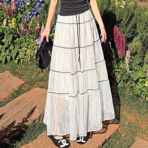 여자 데일리 쉬폰 스커트 레이스 망사 여름 하이웨스트 슬림핏 볼륨 케이크 A라인 롱 SPO마켓2