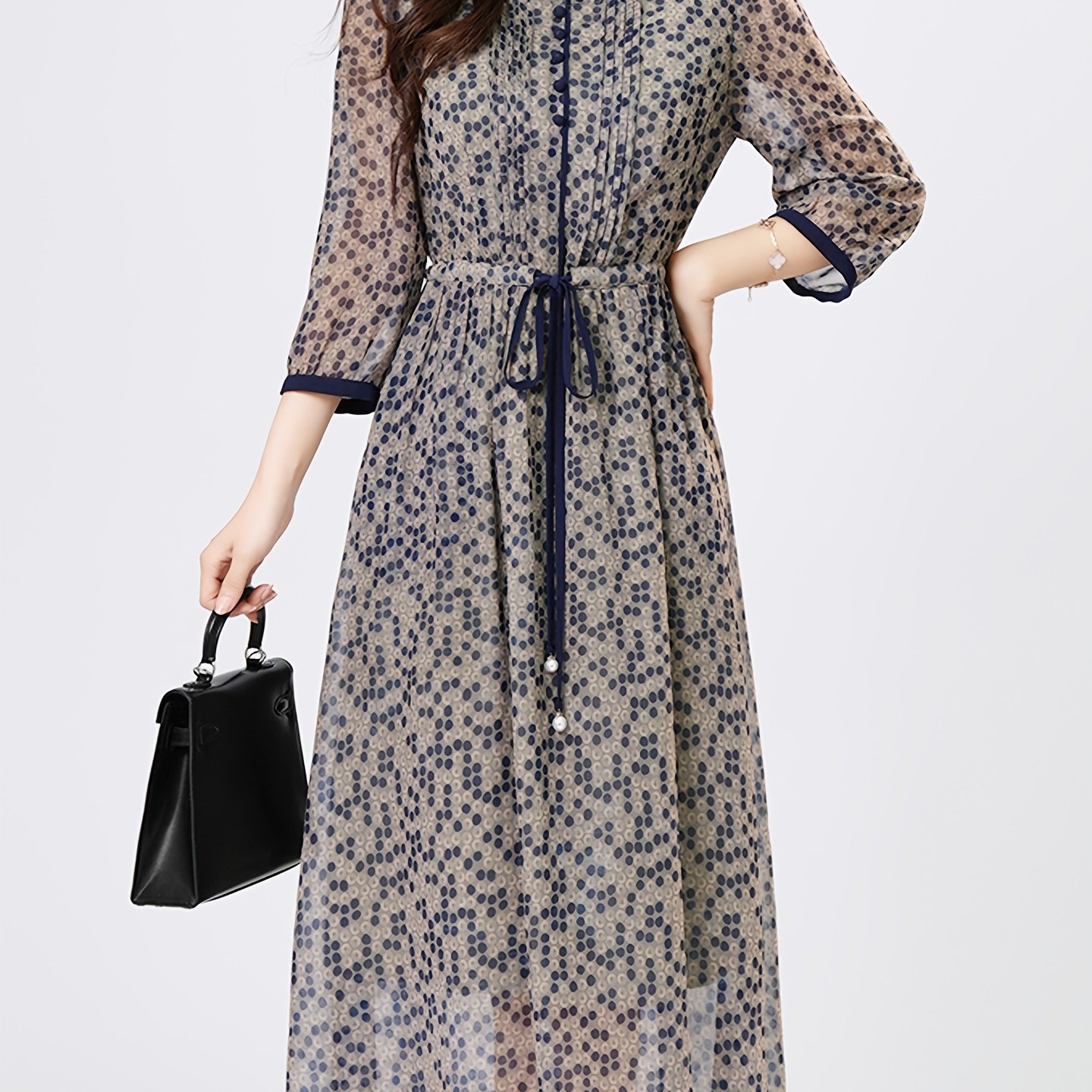 TEMU 우아한 블루-그레이 폴카 도트 프린트 여성 드레스, 라운드넥 버섯 모양 디자인, 편안한 7/4 소매 롱 드레스, 조절 가능한 드로스트링 허리, 데일리 출퇴근 캐주얼 데이트 드레스, 봄, 여름, 가을 레깅스 드레스