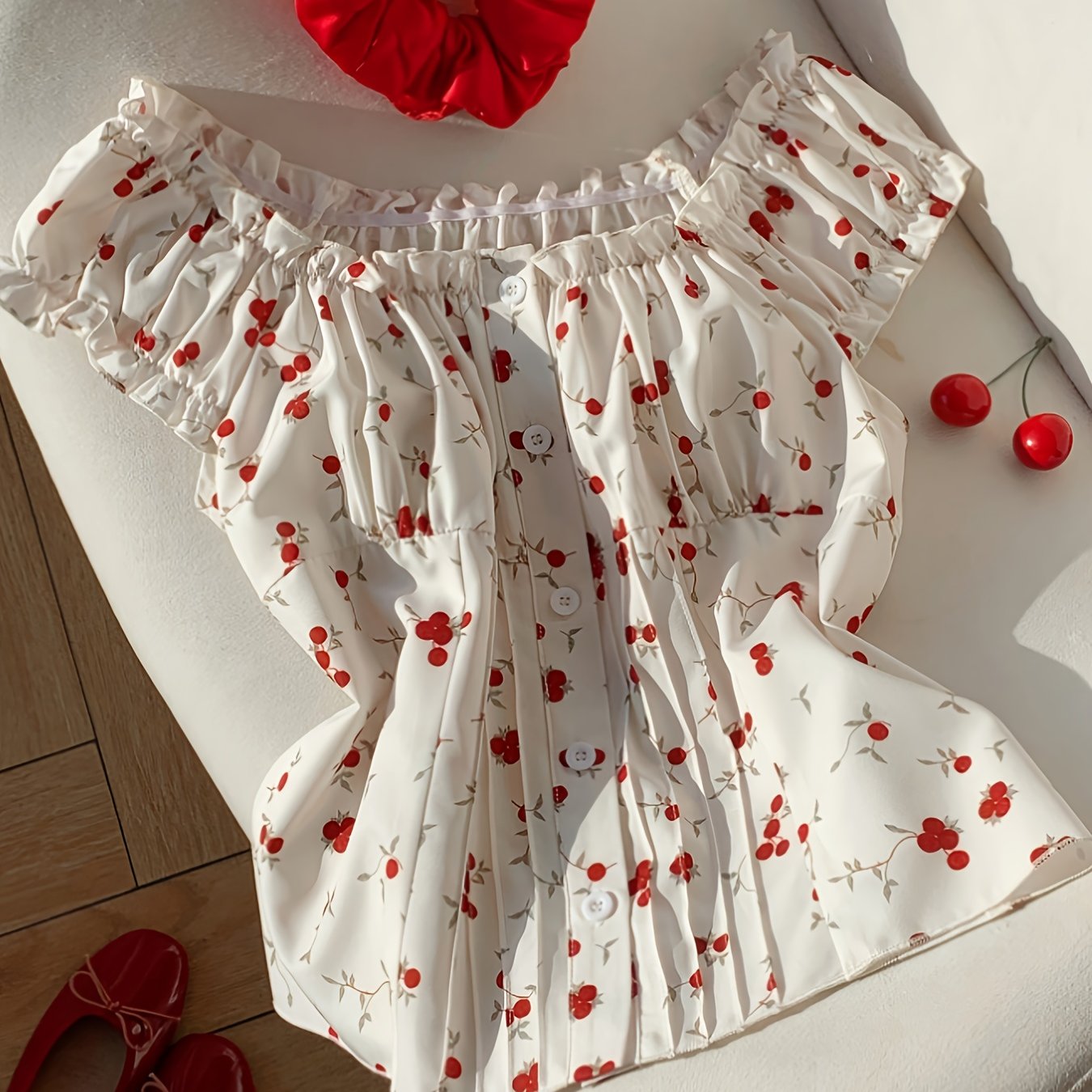 TEMU 여성 체리 프린트 탑, 프렌치 여성스러운 프린트 오프숄더 버튼 버섯 엣지 반팔 티셔츠 탑 셔츠 블라우스 여성 여름 디자인 슬림핏 오프숄더 탑 여름, 봄, 가을, 데이트 파티 출퇴근 댄스 웨어에 적합