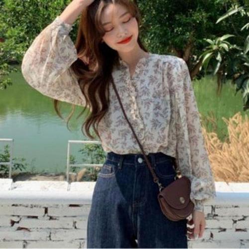 슬림소녀 여성 봄가을 패션 브이넥 블라우스 기질 슬림핏 플라워 캐주얼 쉬폰 셔츠