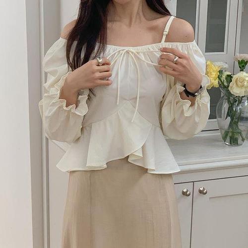 [다잇템] 여자 벚꽃 볼드숄더 스모킹 피크닉룩 프릴 블라우스