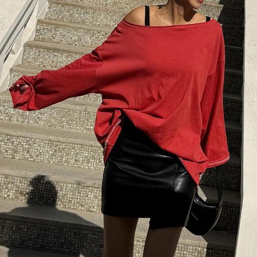 [다잇템]여자 롱슬리브 자수 민무늬 박시핏 박스 티셔츠