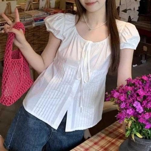 [에이치플러스몰]스퀘어넥 셔링 퍼프소매 스트링 블라우스 프릴 여름