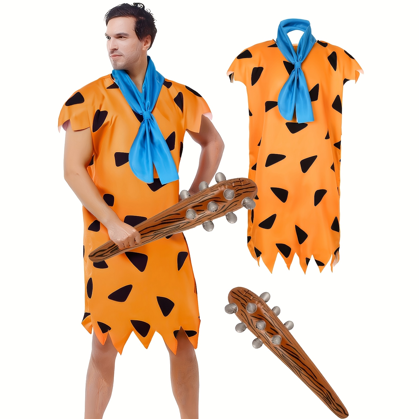TEMU 할로윈 카니발용 남성 스톤 에이지 코스튬 3종 세트, 클래식 동굴인 파티 의상 (블루 스카프 및 클럽 포함), 성인 파티 코스튬