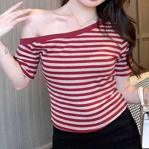 캡소매 여름 여성 반팔 크롭 티셔츠 스트라이프 상의 WFKBX2M