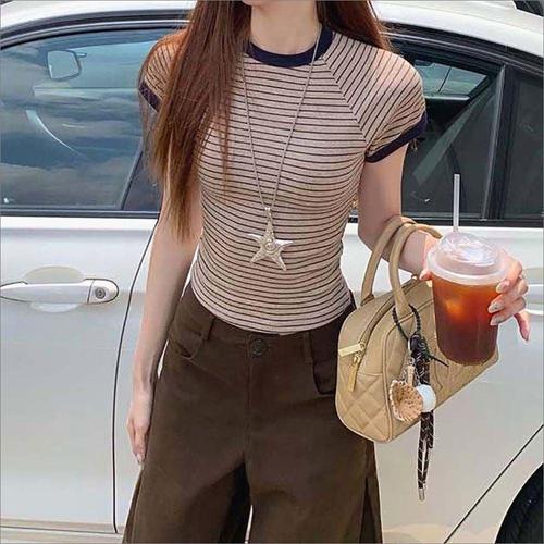 NT3324 여성 캐주얼 단가라 크롭 라운드넥 반팔 티셔츠