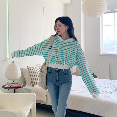 [옷자락] 여자 모던 단가라 배색 크롭 후드티
