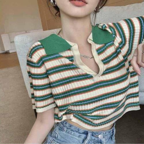 카라 크롭 스트라이프 여성반팔티 니트 캐주얼티 WFKBWXA