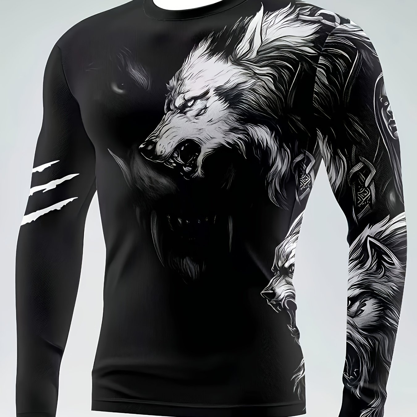 TEMU 남성용 긴팔 티셔츠, 동물 늑대 타투 프린트, 캐주얼 스타일, 프린트 디자인 (텍스처 없음)